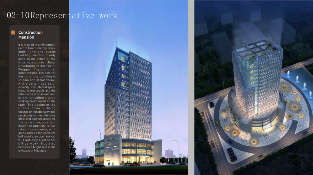 平泉市建設大廈在地標性建筑設計中的重要實踐。他通過現代建筑語言與地域文化的結合,打造出一座兼具功能性與象征意義的城市地標,展現了其在公共建筑設計中的深厚造詣。(平泉市建設大廈)